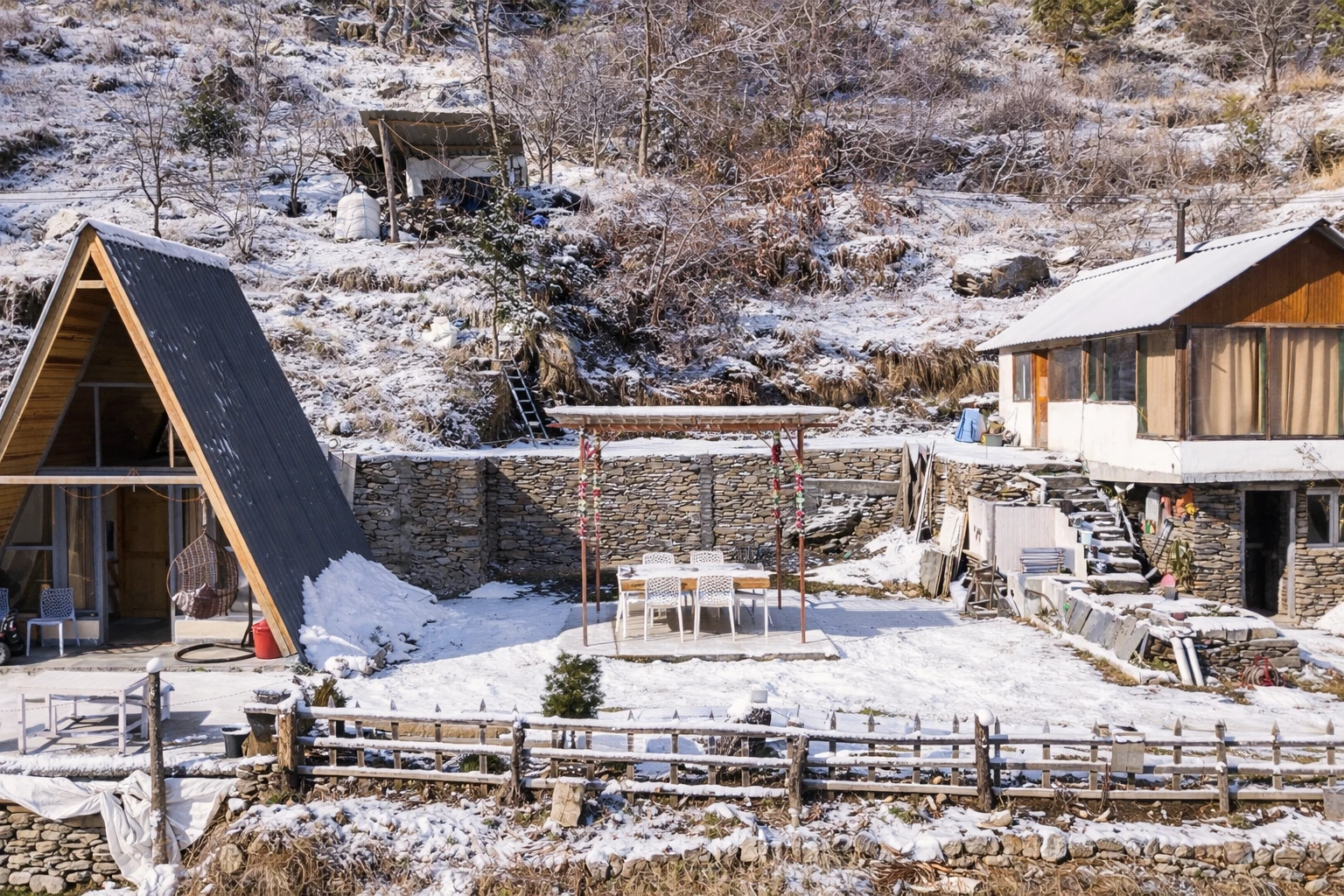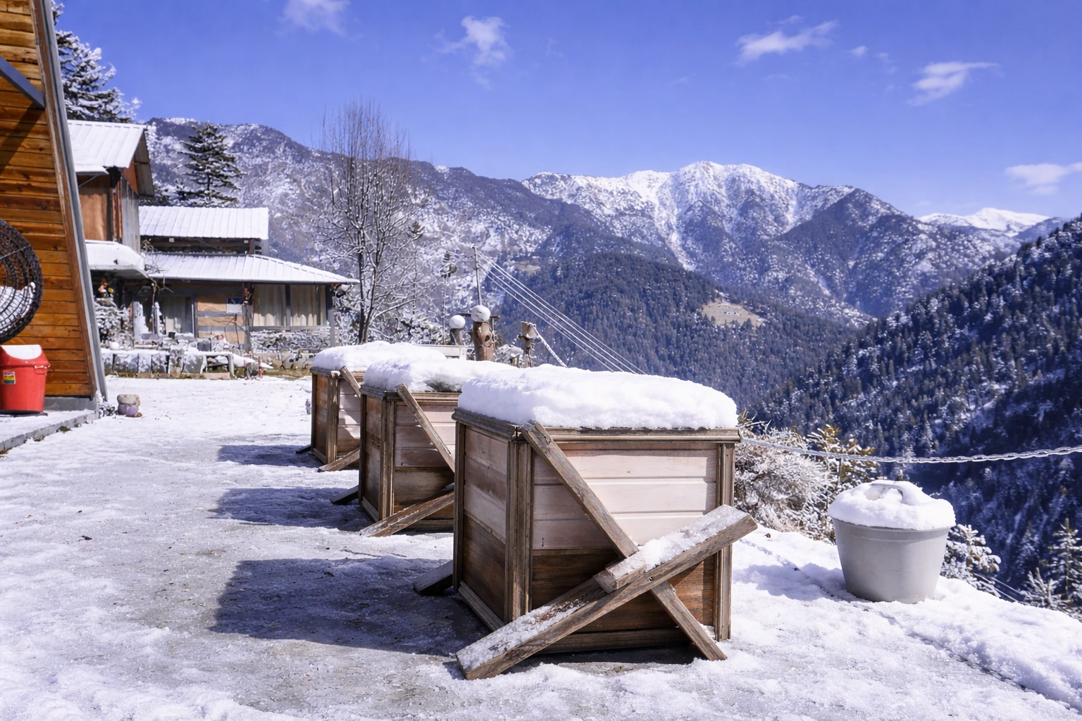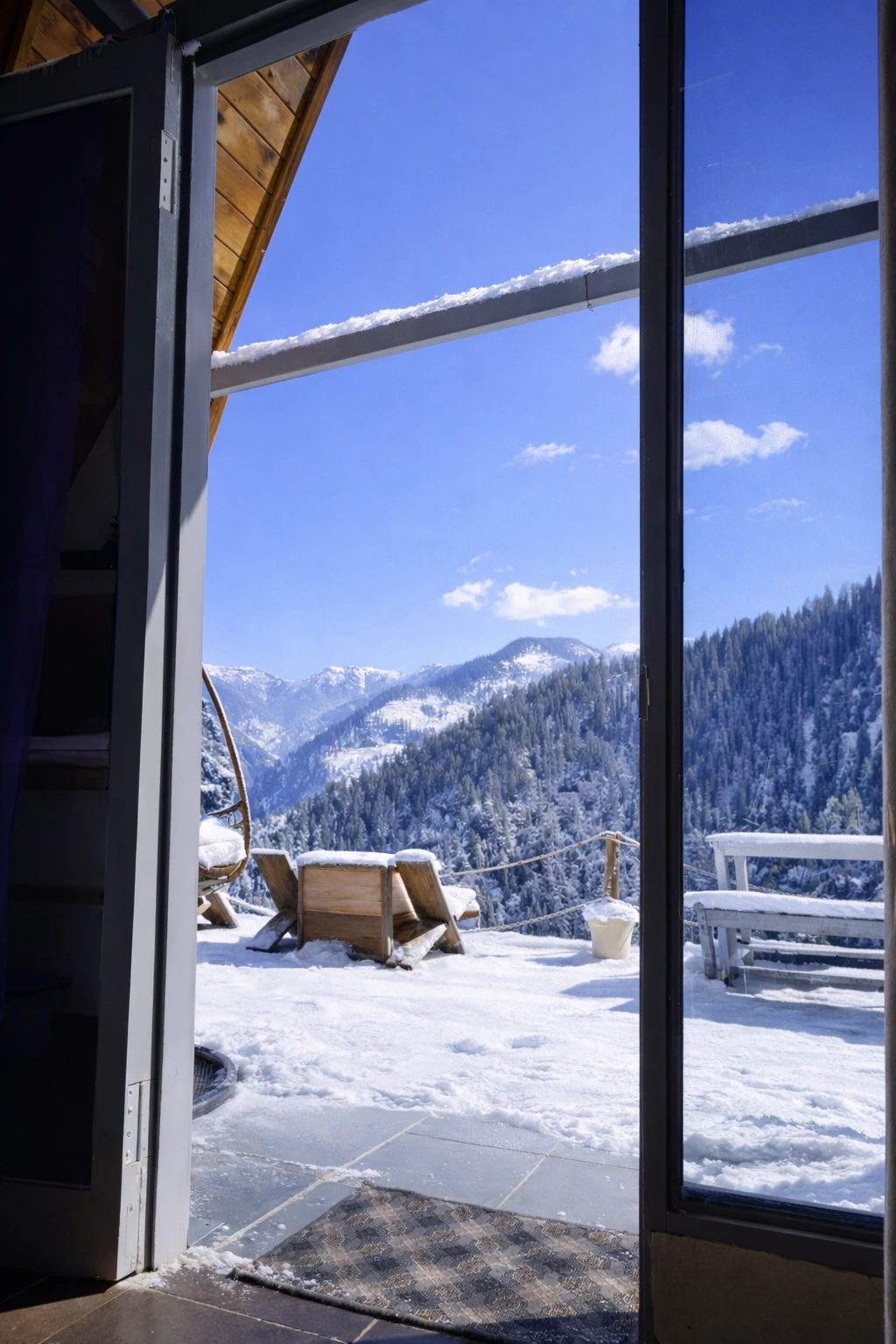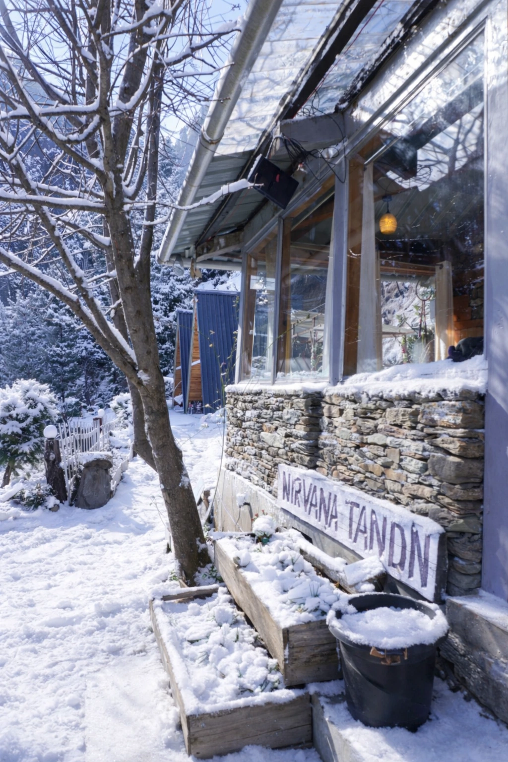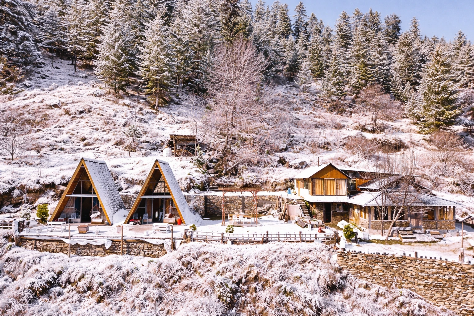 Wrapped in a blanket of snow, Nirvana Tandi transforms into a serene winter paradise surrounded by silent forests and white mountain views.