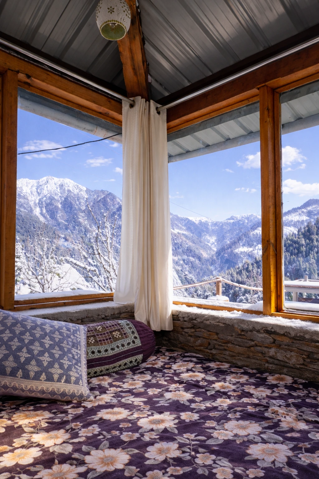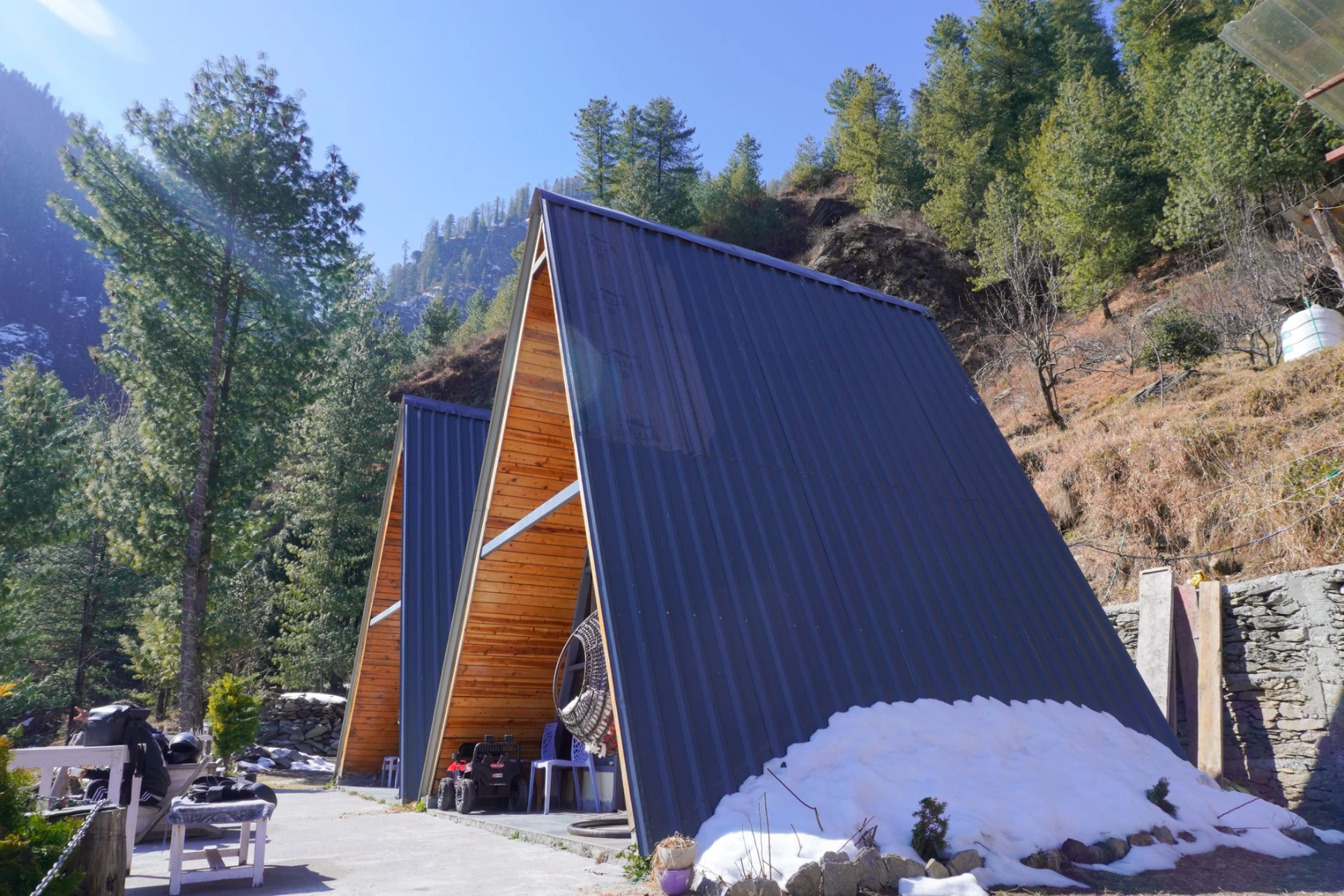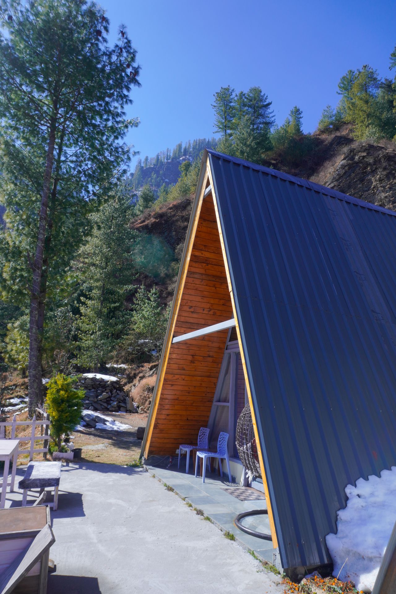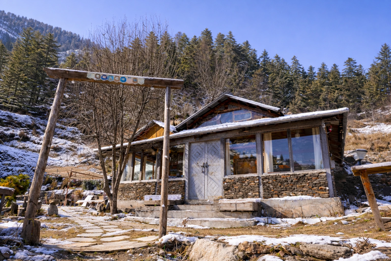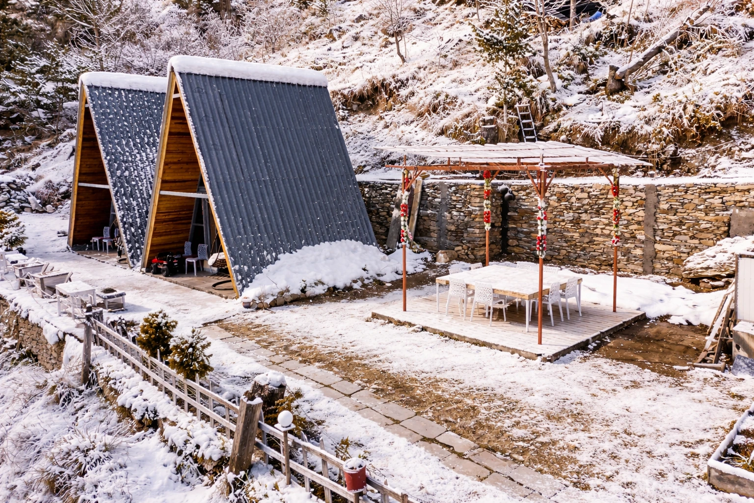 Wrapped in a blanket of snow, Nirvana Tandi transforms into a serene winter paradise surrounded by silent forests and white mountain views.